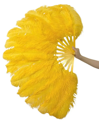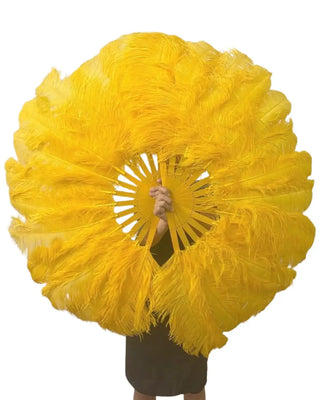 Abanico de plumas de avestruz de una sola capa de color amarillo dorado, totalmente abierto 180 grados 25"incógnita 50"