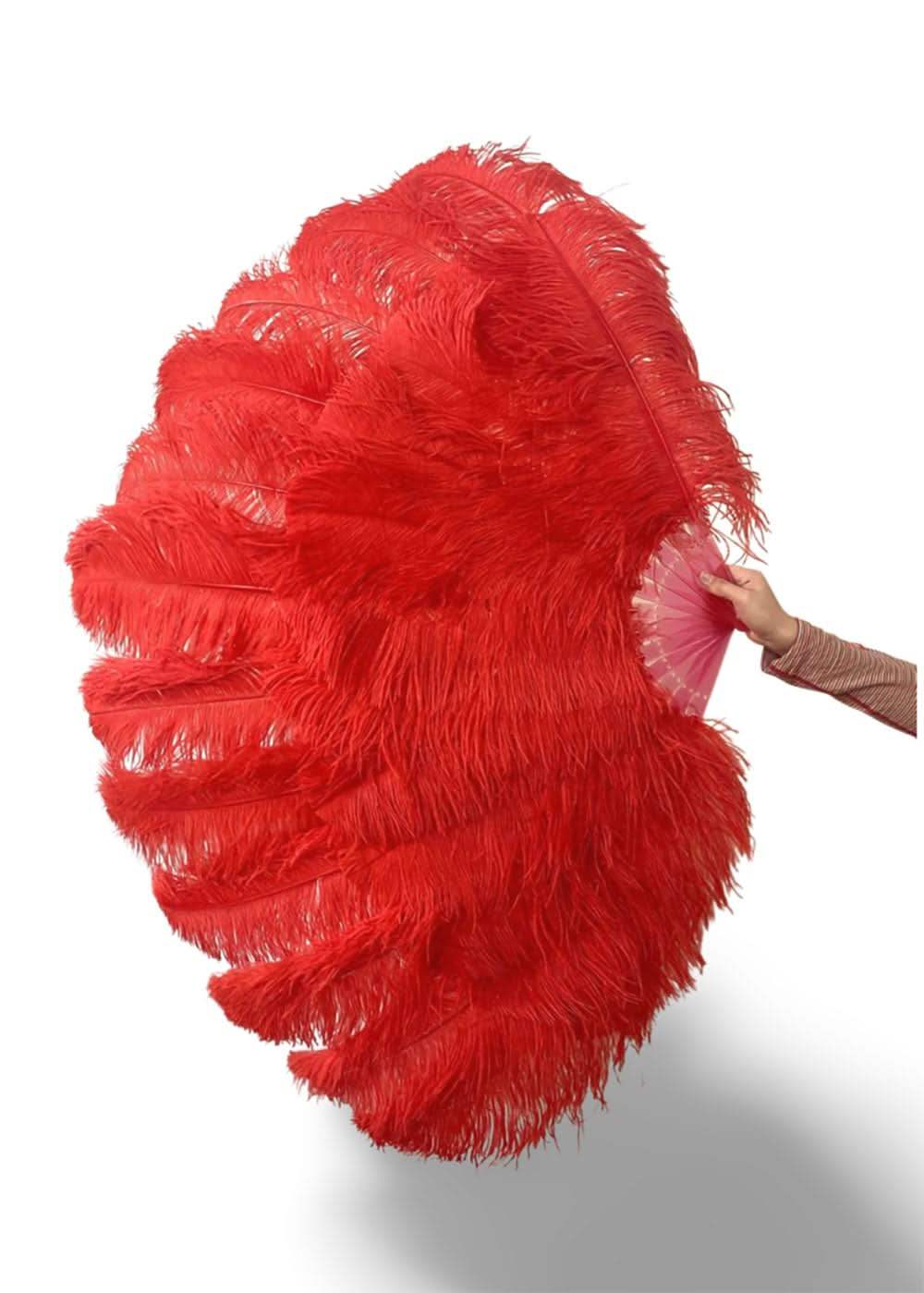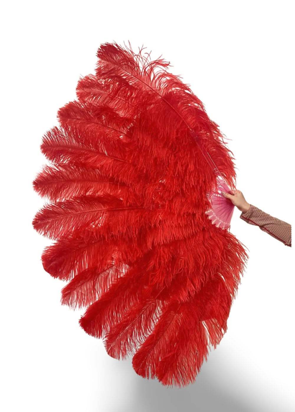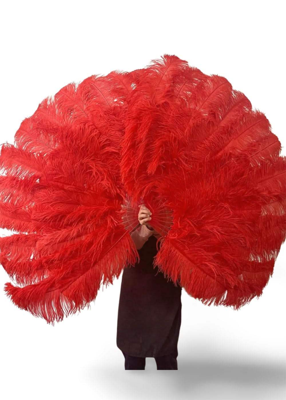 Éventail burlesque de luxe en plumes d'autruche – Rouge somptueux | Couverture complète & Manœuvrabilité experte